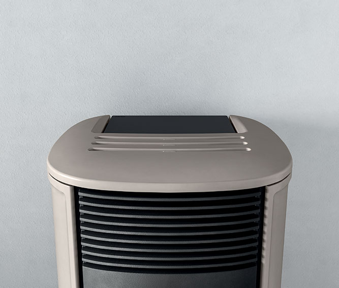 Questa stufa è disponibile nella variante con scarico fumi sul top anziché sul retro. Questo consente un’installazione a filo muro, che riduce l’ingombro in profondità della stufa e di conseguenza ottimizza lo spazio abitativo.